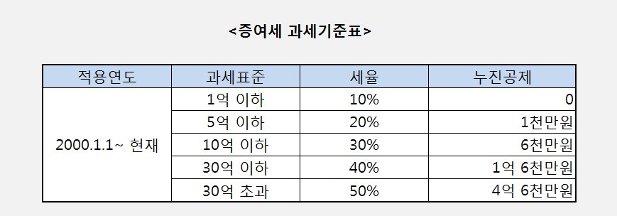 하지만 증여는 재산이 아무 조건없이 무상으로 넘어가는 경우가 대부분이기 때문에 액수가 높으면 높을 수록 그 세율 또한 높아질 수 밖에 없는데요, 부동산이나 재산 등과 같은 재산증여의 경우에는 시가를 기준으로 하여 실제 거래되는 금액을 기준으로 부과되며, 시가를 알 수 없을 땐 감정가 및 기준시가 등을 통해 시가를 책정합니다.