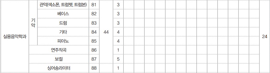 수시 기준으로, 서경대 실용음악학과는 크게 기악, 연주작곡, 보컬, 싱어송라이터 4개의 전공으로 나뉘어져 있어요. 실용음악과 입학정원은 40명대로 많지 않은데 이 중에서도 4개의 전공으로 쪼개지다보니 선발 인원 자체가 많지가 않습니다.