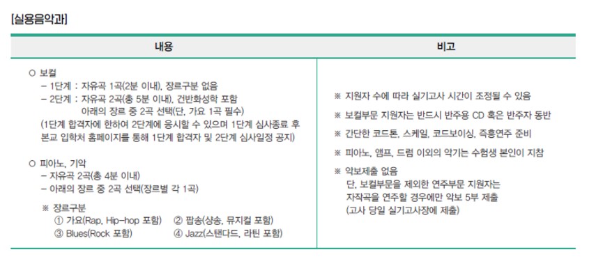 동아방송예술대는 크게 기악, 성악(보컬), 작곡 전공으로 나뉘어지고 여기서도 또 세부전공이 나뉘어져요. 다른 대학에 비해 입학정원은 많은 편이지만, 실기 시험이 1차, 2차로 나뉘어지고 요구사항이 좀 더 많은 편이니 지원하시기 전에 입학 요강을 꼼꼼히 살펴보셔야 합니다.