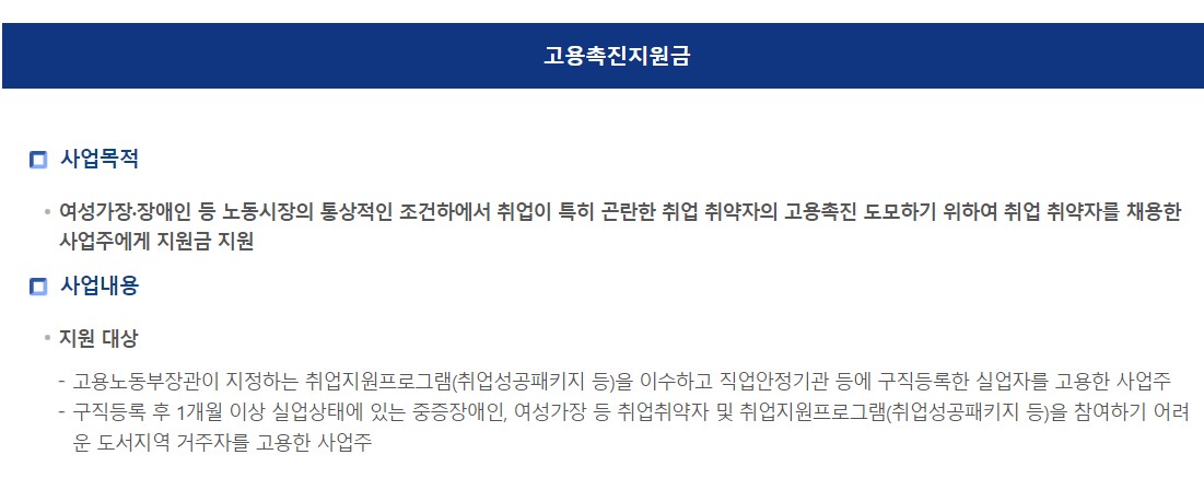 고용촉진지원금은 상대적으로 노동시장에서 취업이 곤란한 취업 취약자들, 취업프로그램을 이수한 노동자의 고용촉진을 위해 탄생한 제도로 이를 고용하는 사업주에게 정부가 소정의 금액을 주어 노동자 고용시 발생하는 지출을 어느정도 지원해주는 것입니다.