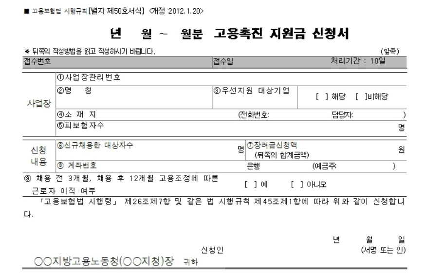 고용촉진지원금을 신청할 때는 필요서류가 있어야 하는데요. 신청서는 고용보험법 시행규칙 별지 제50호에 있는 서식을 이용하면 되고 월별 임금대장 사본과 급여이체 내역, 근로계약서 사본 1부, 지원금 입금통장 사본1부를 준비하여 신청하면 됩니다.
