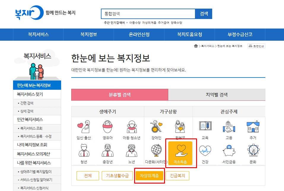 이러한 차상위계층 신청은 해당 지원받고자하는 항목을 클릭하면 그에 맞는 신청방법을 확인할 수 있는데요, 주로 관할 주민센터나 담당부처에 문의하는 방법으로 지원항목에 따른 필요서류도 각각 다르니 복지로 홈페이지를 참조하면 좋겠습니다.