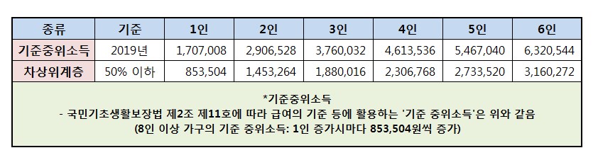 2019년 기준 보건복지부에서 고지한 기준 중위소득은 1인 약 170만원, 2인 약 290만원, 3인 약 376만원 정도 되는데요, 이 금액에서 50%이하 금액인 1인 약 85만원입니다.