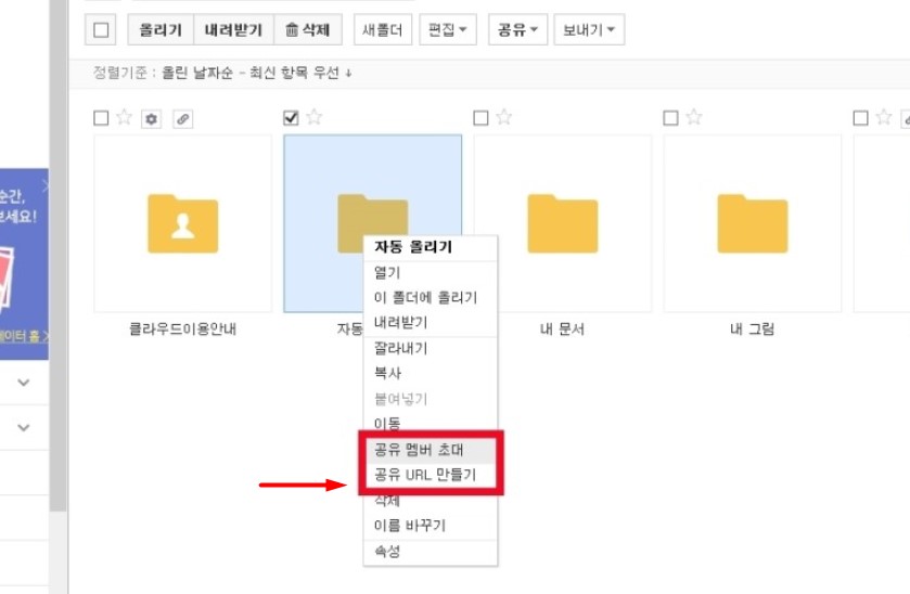 네이버 클라우드는 무려 30기가를 제공하고 있는데요, 클라우드에 파일을 올려놓은후 마우스 오른쪽 버튼을 눌러 '공유 URL 만들기'를 눌러주면 공유링크가 생기는데요, 이것을 전송하고자 하는 상대방에게 보내면 됩니다.