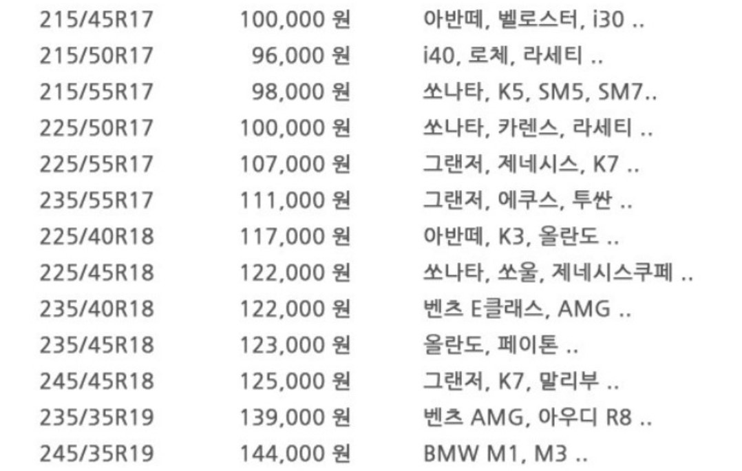 만약 자신의 차종이 모닝이나 레이라면 1짝당 6만 ~ 9만 정도가 소요되고 벤츠나 BMW 같은 외제차량이라면 15 ~ 18만원이 소요될 것 같습니다. 그러니 타이어 교체비용을 너무 비사게 부르는 곳을 가지 마시기 바랍니다.
