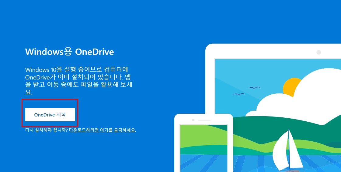 그러면 [다운로드]라 적힌 부분을 볼 수 있을 것입니다. 이곳을 눌러 원드라이브를 설치해주세요. 저는 이미 설치를 하여 [원드라이브 시작]이라 적혀있네요. 원드라이브가 설치되어 있지 않은 분들은 저 부분이 [다운로드]라고 되어 있을 것입니다.