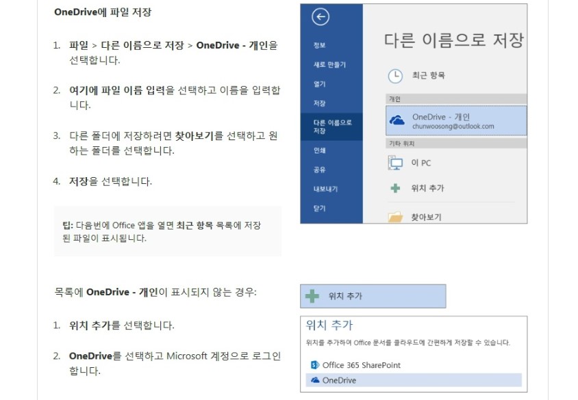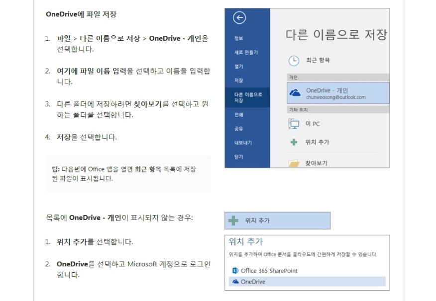 업로드 방법을 알았으니 이제 파일을 저장하는 원드라이브 사용방법도 살펴보겠습니다. 우선 파일 -> 다른 이름으로 저장 -> [원드라이브 - 개인]을 선택해주세요.