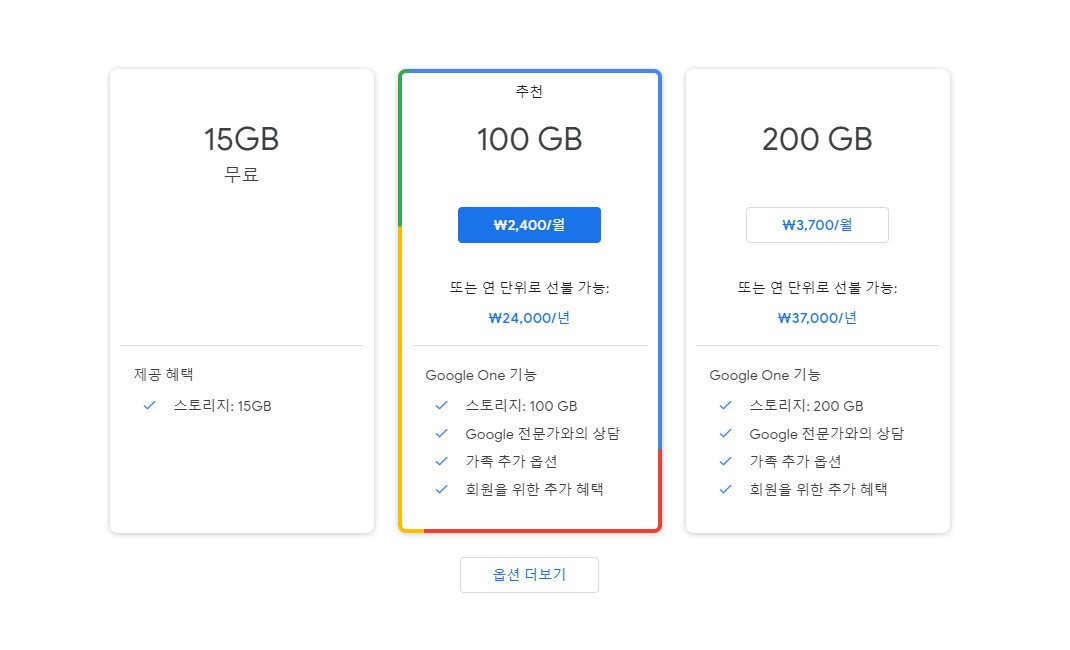 그러면 100GB, 200GB의 용량으로 업그레이드 할 수 있는 화면이 출력되는데요. 무료로 제공하는 용량은 15GB로 이정도는 요새 동영상 몇개면 꽉차죠. 100GB는 월 2,4000원, 200GB는 월 3,7000원의 요금을 받고 있습니다. 저렴한 편이죠?