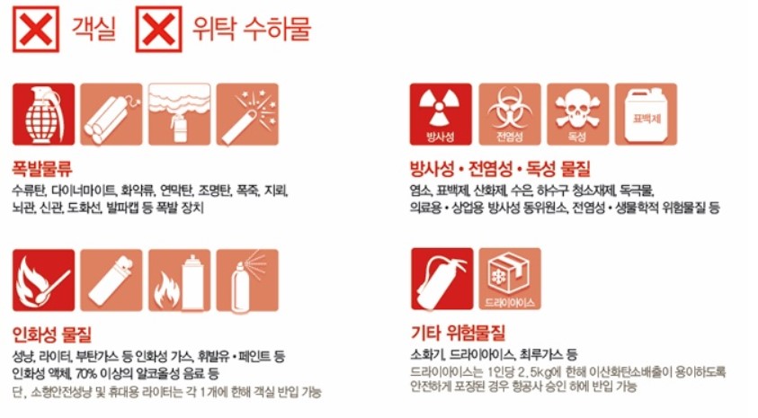 무게는 대체로 10kg 이내지만 대한항공과 진에어 항공이 좀더 많은 무게를 허용하고 있는데요. 이렇게 기내용 캐리어 사이즈는 항공사별로 차이가 있기 때문에 여행 출발 전 미리 이를 확인하여 짐을 싸는 것이 좋습니다. 기내용 캐리어 짐을 꾸릴 때는 기내 반인 금지 품목이 들어가지는 않는지 따져봐야하는데요.
