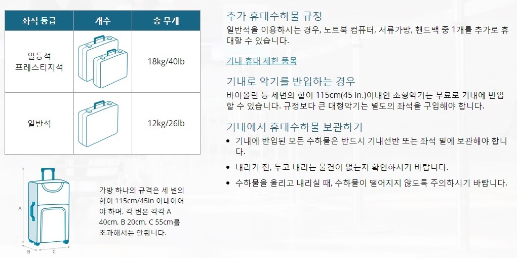 우리나라를 대표하는 항공사인 아시아나와 대한항공을 비교하면 둘 모두 삼변의 합이 115cm 이내로 큰 차이가 없는데요. 다만 대한항공이 좀더 무게 허용범위가 넓은 편인 것을 알 수 있습니다.