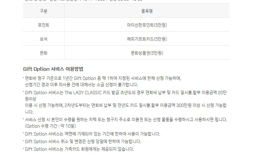 신한카드에서도 비슷한 할인카드가 있습니다. 신한 레이디클래식 카드는 학원비 할인카드로 특화된 것은 아니지만 옵션서비스를 잘 활용하면 큰 혜택을 누릴 수 있습니다. 1년에 1회 옵션품목을 설정할 수 있는데 이대 마이신한포인트, 해피기트프카드, 문화상품권 중에서 한 가지를 5만원 혜택을 볼 수 있습니다.