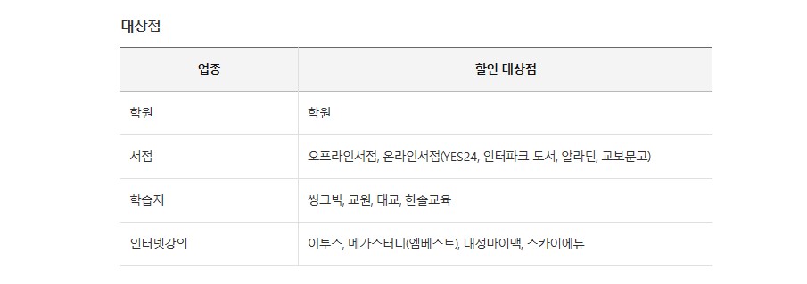 할인이 가능한 곳은 전국 학원, 학습지, 독서실 업종입니다. 온라인 학원은 할인이 가능하고 유치원, 자동차전문학원은 제외됩니다. 자녀 감성발달에 필요한 가맹점 예를 들면 수영자, 스포츠센터 등도 결제시 5% 할인이 적용되고 자녀의 도서 구매시에도 5% 할인됩니다. 온/오프라인 모두 적용이 되는데, 백화점이나 쇼핑몰 입정 오프라인 매장은 제외됩니다.