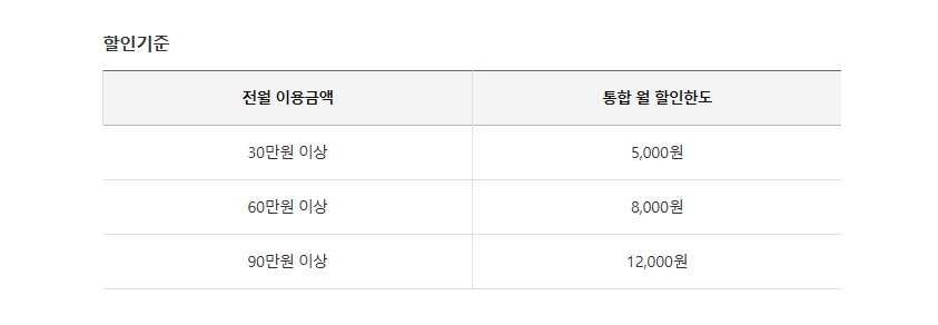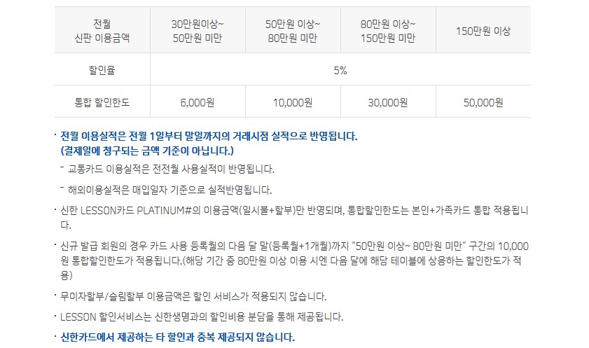 전월 실적에 따라 할인 %가 달라집니다. 전월 실적이 30만원 이상부터가 할인 가능한데, 이땐 5% 가능하고 최대 할인금액 한도는 1만원입니다. 150만원 이상의 실적이 있다면 10%까지 할인되고 최대 5만원까지 할인 받을 수 있습니다.