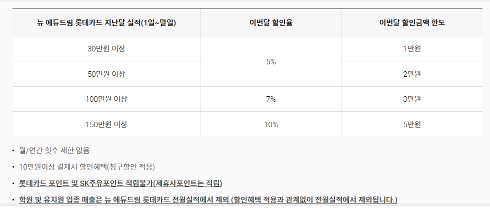 롯데의 뉴 에듀드림 카드의 연회비는 1만원입니다. 월간, 연간 횟수 제한이없이 결제시 청구할인이 가능한데, 학원, 유치원 등이 가능합니다. 다만 학습지 같은 방문교육의 경우는 혜택이 불가능하고 아쉽게도 인터넷 강의도 적용이 안됩니다.