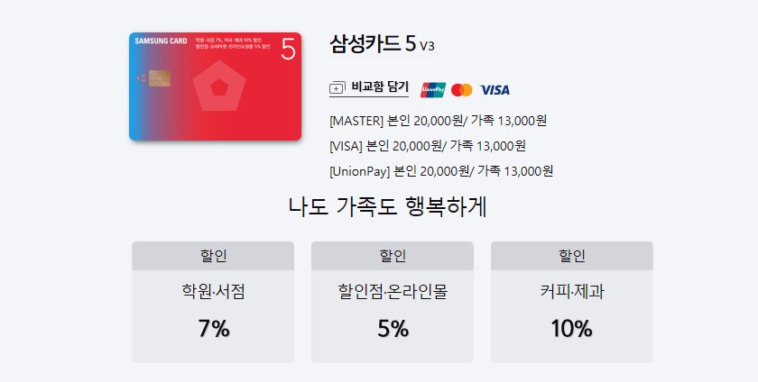 삼성카드에서 나온 5 V3카드는 학원, 서점, 학습지, 인터넷강의 7% 결제일 할인이 됩니다. 할인점, 슈퍼마켓, 온라인 쇼핑몰의 경우 5% 할인도 가능하고, 커피전문점, 제과점은 10% 할인이 되기 때문에 전천후 실용적인 카드입니다. 앞의 카드들이 5%인데 7%는 확실히 매력적입니다.