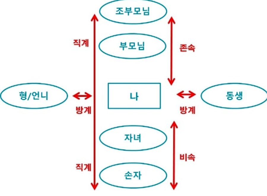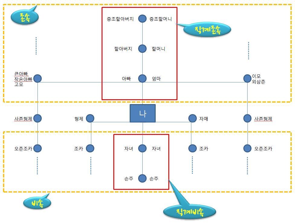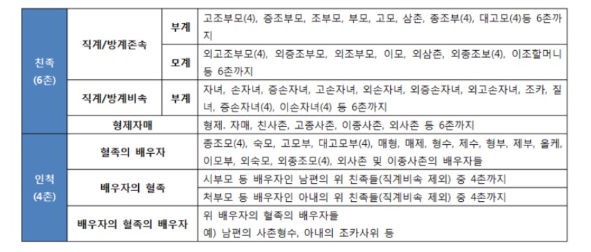 참고로 친족은 혈족과 인척으로 나뉘는데, 앞에서 설명드린 직계혈족과 방계혈족이 혈족입니다. 가족에는 배우자와 직계혈족, 직계혈족의 배우자, 배우자의 직계혈족, 배우자의 형제자매, 본인의 형제자매가 포함됩니다.