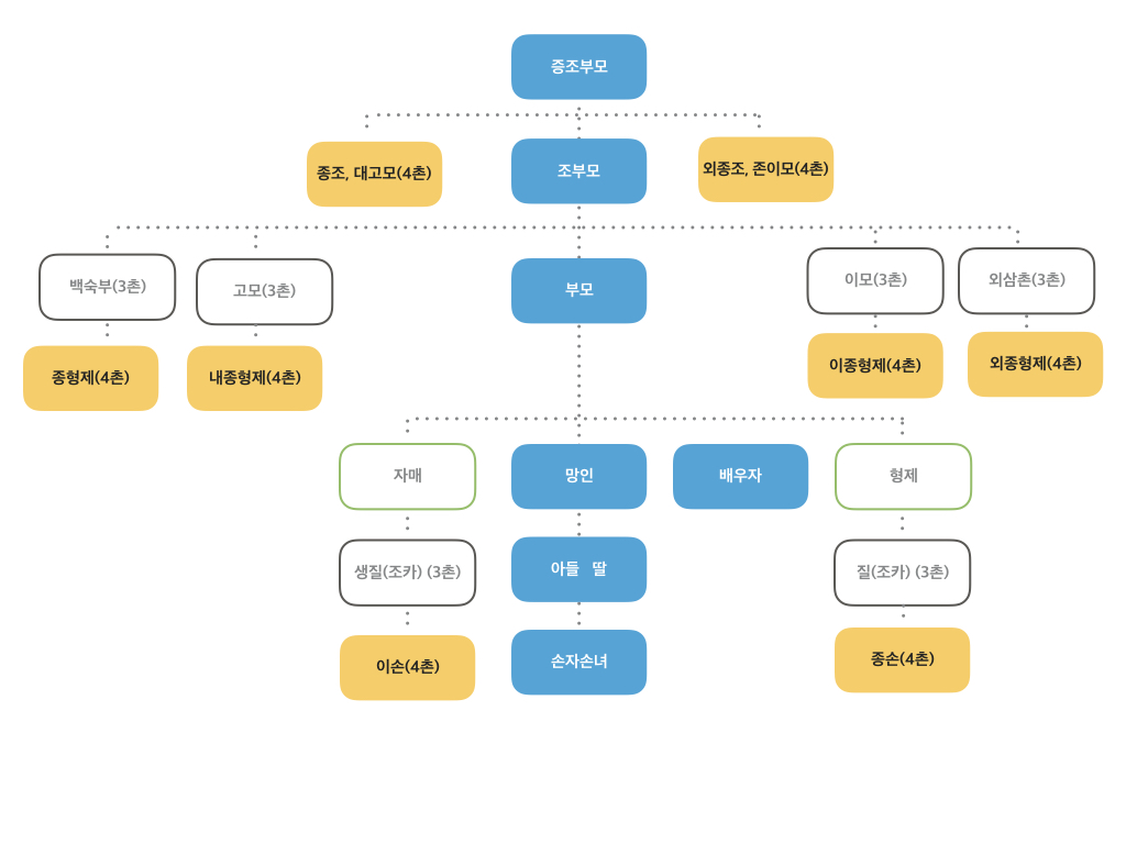또다른 개념도 알아둘 필요가 있습니다. 인척은 배우자의 혈족, 혈족의 배우자, 배우자의 혈족의 배우자를 의미합니다. 말장난하는 것처럼 느껴져 확 다가오지 않으실텐데 예를 들면 장인, 장모, 시아버지, 시어머니, 시동생, 형수, 이모부, 사위, 며느리, 처남댁, 동서 등이 모두 인척에 포함됩니다.