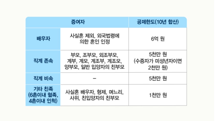 증여세는 받은 돈 대비 무조건 %로 계산하는 게 아니라 관계에 따라 증여세를 면해주는 증여세 공제한도가 존재합니다. 이때 배우자는 6억까지 공제가 되고 직계비속은 5천만원까지 공제가 되므로 매우 중요하겠죠?