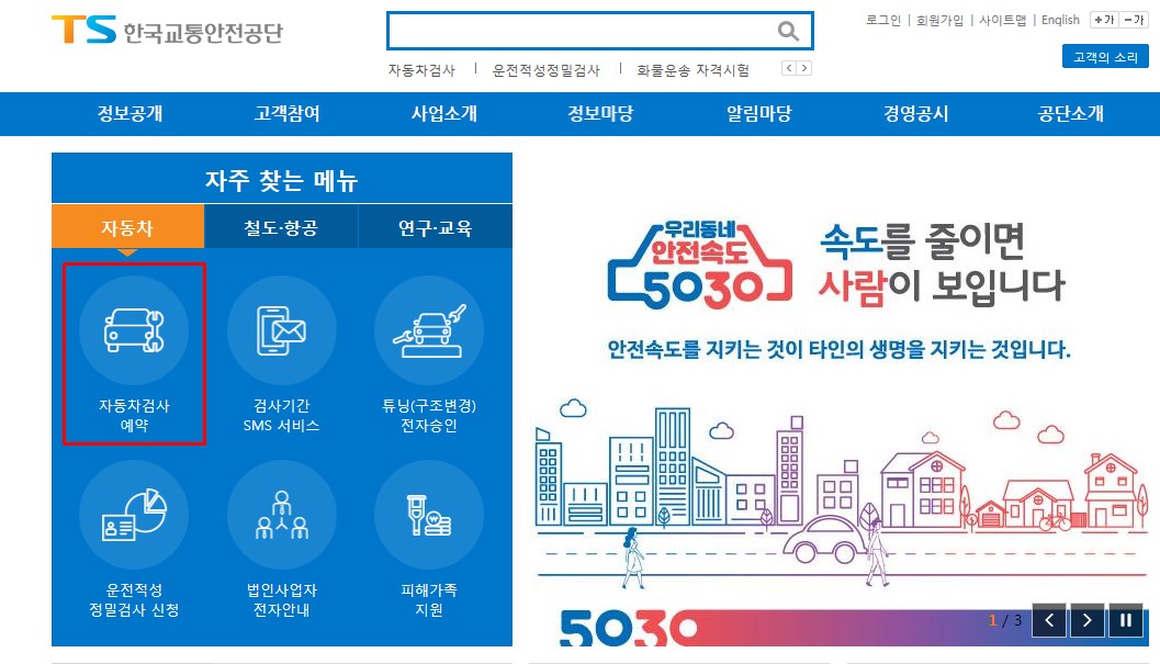 해당 홈페이지를 검색하여 접속하면 메인화면에서 [자동차검사 예약]이라는 메뉴를 바로 확인할 수 있는데요, 여기서 자신의 차량검사 기간을 빠르게 조회할 수 있음과 동시에 예약까지 할 수 있으므로 간단하게 차량검사를 진행할 수 있게 됩니다.