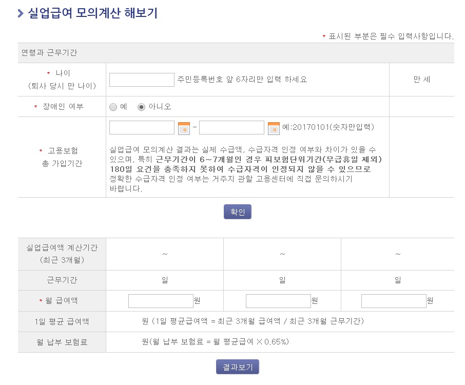 본인이 받을 실업급여에 대해서 자세히 알아보고 싶다면 '고용보험'사이트를 이용해 보시길 바라요. 나이, 고용보험 총 가입기간, 월 급여액을 입력한 정보를 토대로 모의 계산을 해보실 수 있습니다.