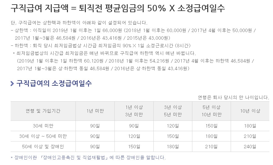 일반적으로 구직급여는 퇴직 전 평균 임금의 50% * 소정급여일수로 계산합니다. 하지만, 상한액과 하한액이 정해져있기 때문에 계산된 금액이 상한액을 초과하는 경우엔 초과 금액에 대해서는 지급받을 수 없으니 주의하셔야 해요.