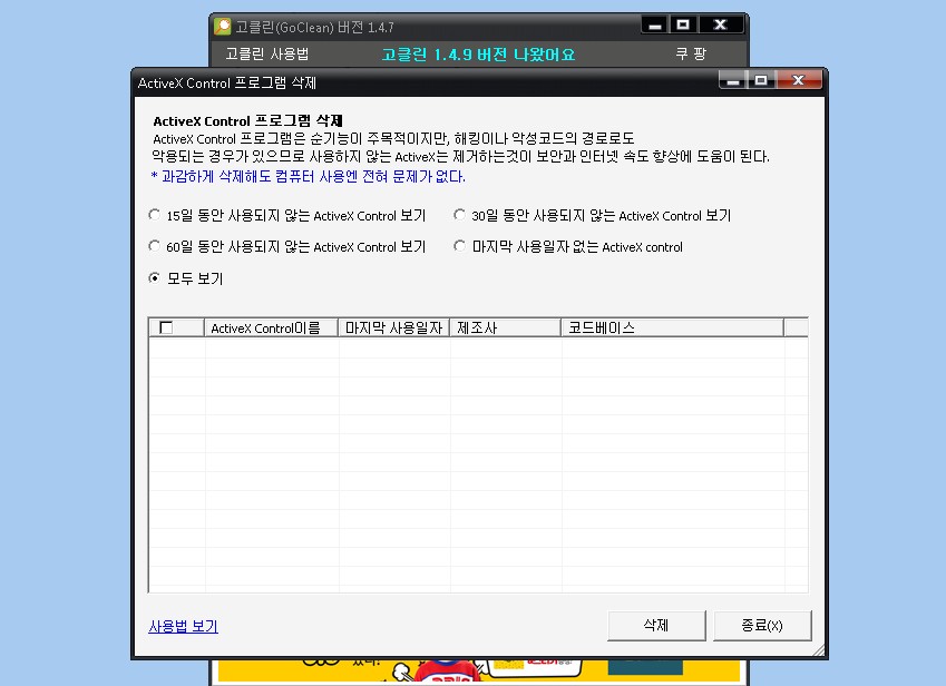 본인이 직접 설치한 프로그램을 제외하고 삭제할 프로그램을 체크해서 삭제를 클릭합니다. 그 다음엔 'Active X'를 삭제할 거예요. 이것도 DLL의 일종입니다. 은행 사이트에 들어가면 보안 프로그램 관련해서 통합 설치를 많이 하잖아요. 그 때 많이 깔립니다.