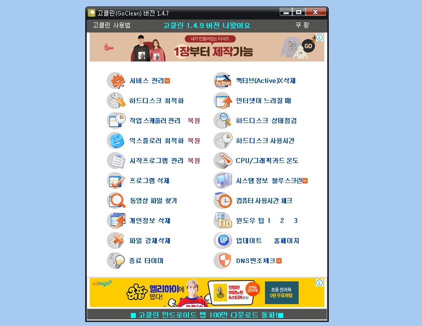 고클린에서는 하드디스크 상태 점검, 시작프로그램 관리, 하드디스크 최적화 등 서비스도 있으니 필요하신 서비스를 이용해보시면 좋을 것 같아요. 좋아지면 좋아졌지, 컴퓨터 사용에 문제가 생기지 않아요.