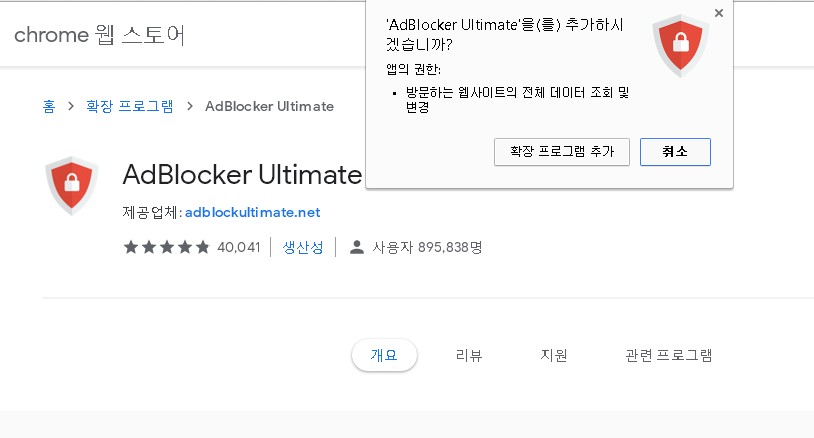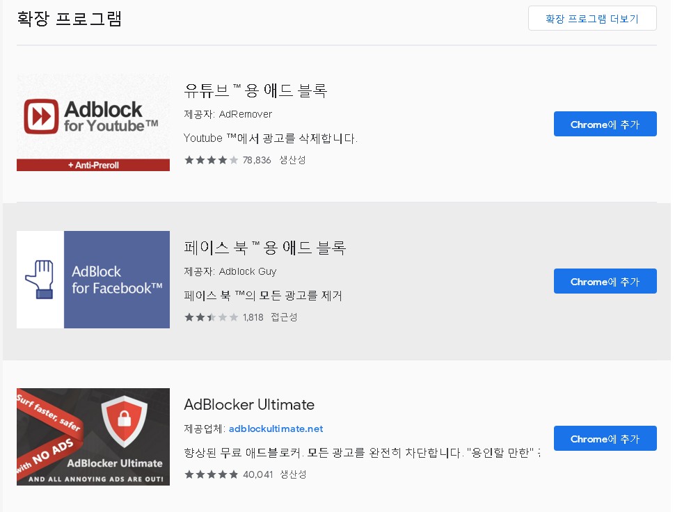 구글에 '크롬확장프로그램'을 검색하고 '애드블록(AdBlocker Ultimate)'이라는 프로그램을 검색하세요. 프로그램을 찾으셨다면, 오른쪽에 'Chrome에 추가'라는 파란색 버튼을 클릭합니다. 그러면 이렇게 추가하시겠습니까?를 물어보고, 추가를 누르면 바로 설치가 진행이 돼요.