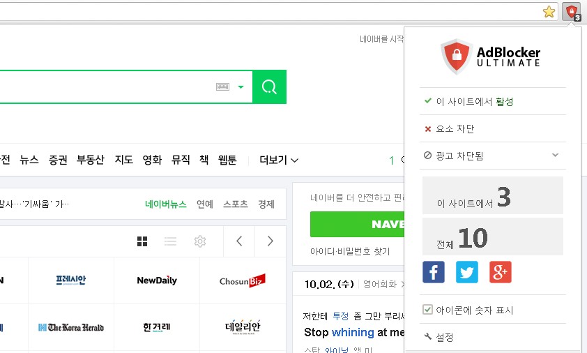 설치가 완료되면 인터넷 주소창 오른쪽에 빨간색 아이콘이 하나 생깁니다. 자동으로 활성화되면서 어느 사이트에 가든 불필요한 광고가 나타나는 것을 방지해줘요.