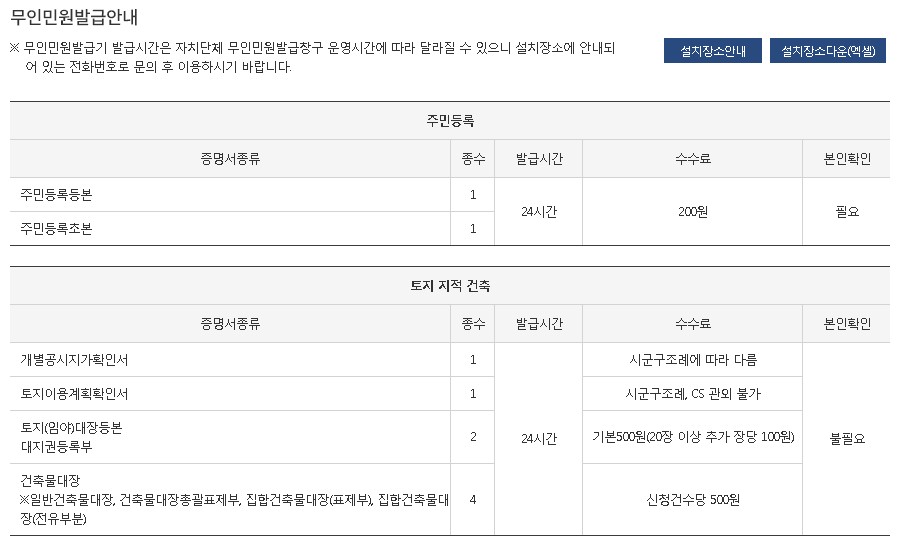 무인발급기에서 증명서 발급받을 때에도 수수료가 부과됩니다. 떼고자 하는 증명서 종류에 따라 다르니 한 번 확인하시고 가시는 게 좋겠죠? 주민등록등본과 초본은 200원이네요. 개별공시지가확인서와 토지이용계획확인서는 시,군,구 조례에 따라 수수료가 달라질 수 있습니다.