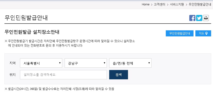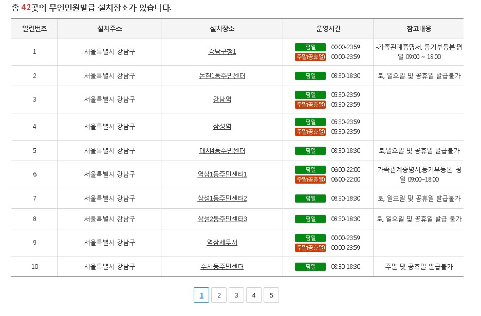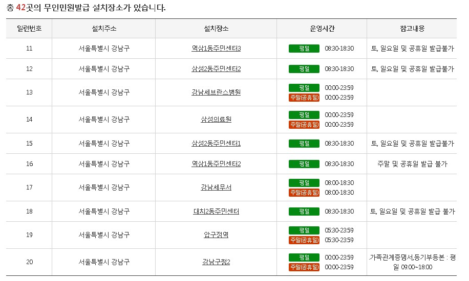 서울특별서 강남구에는 42곳에 무인민원발급기가 설치되어 있네요. 설치장소에 따라 운영시간이 다르기 때문에 꼭 확인하고 가셔야 해요. 보통보면, 주민센터에 위치한 무인민원발급기는 주민센터 운영시간과 비슷하지만, 역내에 위치한 무인발급기는 늦게까지 운영하는 것 같아요.