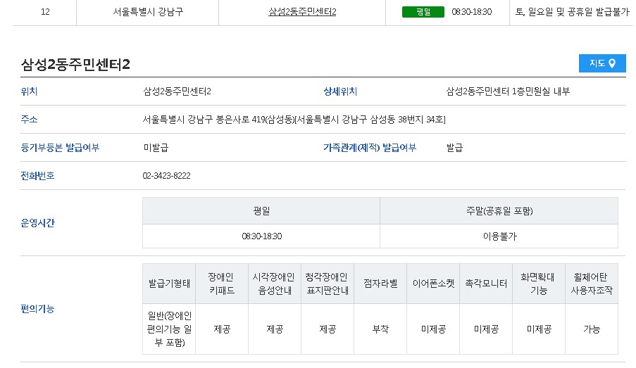 본인이 가고자 하는 무인민원발급 설치장소를 클릭하면 관련 상세 내용이 떠요. 삼성2동주민센터2를 클릭해보니, 이곳에서는 등기부등본은 발급하지 않지만, 가족관계증명서는 발급이 가능하다고 확인되네요.