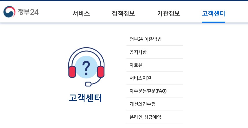 무인발급기 관련 정보는 '정부 24' 홈페이지에서 확인하실 수 있어요. 정부 24 홈페이지에 들어가시면, 상단 메뉴에서 '고개센터 - 서비스 지원'을 클릭하세요. 가족관계증명서 무인발급기 위치를 알기 위해서는 서비스 지원 중에서 네 번째에 위치한 '무인민원발급 안내'를 클릭하셔야 합니다.