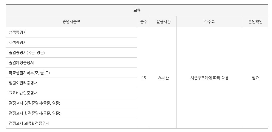 성적증명서와 같은 교육관련 증명서의 수수료는 시,군,구 조례에 따라 다릅니다. 사업자등록증명서와 같은 국세청 증명서와 건강보험 증명서는 수수료 무료입니다.