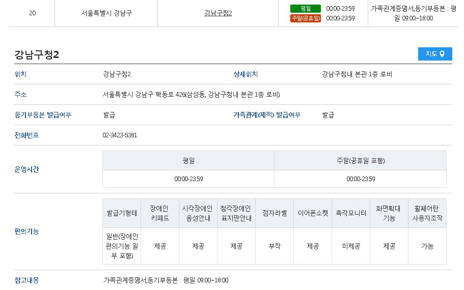 강남구청2에 위치한 무인발급기를 확인해보니, 등기부등본과 가족관계증명서 발급이 가능하다고 떠요. 하지만 평일 9시부터 18시까지만 등기부등본과 가족관계증명서 발급이 가능한 것으로 확인되네요. 이렇게 본인이 원하는 장소에서 발급받고자 하는 증명서를 취급하는지 꼭 확인하시고 가셔야 헛걸음 안 하실 수 있습니다.