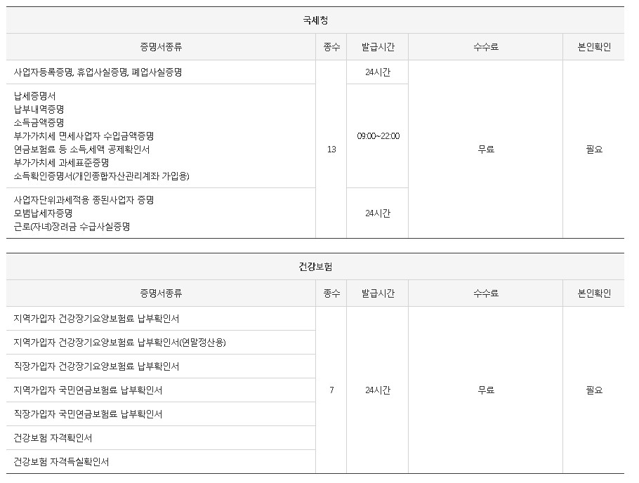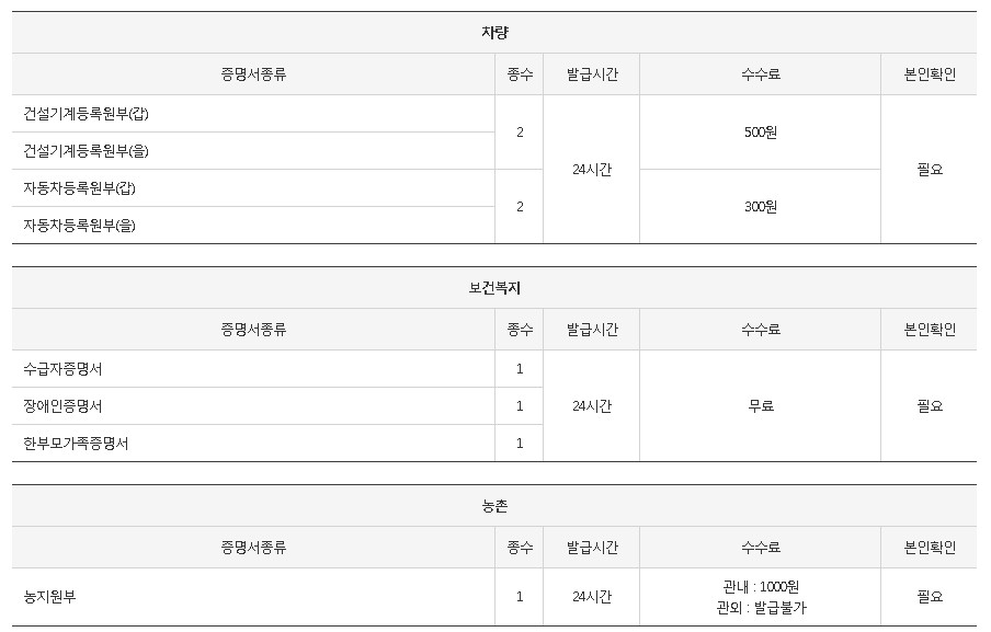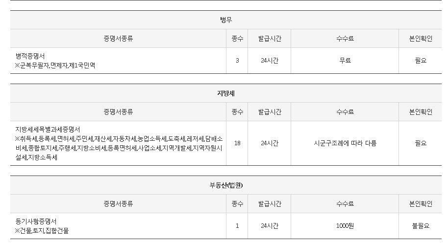 보건복지 관련 증명서와 병무관련 증명서는 수수료가 무료입니다. 일반적으로 증명서 발급 받을 때, 본인확인이 필요하지만, 건물, 토지, 집합건물의 등기사항증명서 같은 경우엔 본인확인이 불필요한 것도 있습니다.
